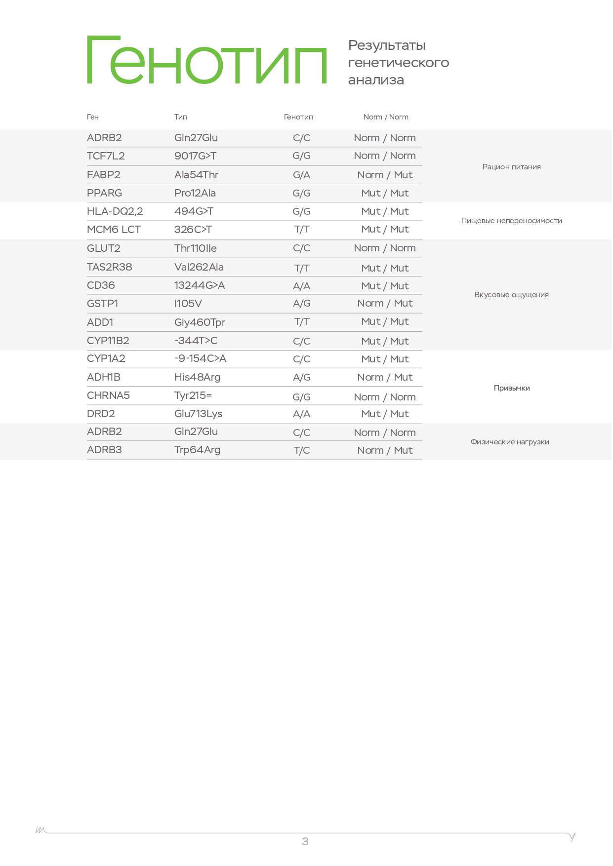 | Рацион питания Метаболизм алкоголя Метаболизм кофеина Физическая нагрузка Непереносимости Вкусовые ощущения Никотин Психологические зависимости Пищевое поведение Потребность в витаминах Уровень холестерина Спортивный потенциал | Рацион питания Метаболизм алкоголя Метаболизм кофеина Физическая нагрузка Непереносимости Вкусовые ощущения Никотин Психологические зависимости Пищевое поведение Потребность в витаминах Уровень холестерина Спортивный потенциал | Рацион питания Метаболизм алкоголя Метаболизм кофеина Физическая нагрузка Непереносимости Вкусовые ощущения Никотин Психологические зависимости Пищевое поведение Потребность в витаминах Уровень холестерина Спортивный потенциал |