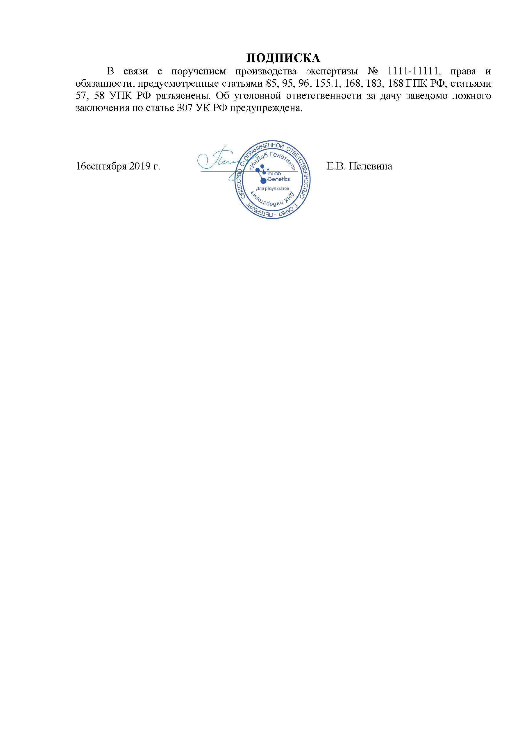 Мы проводим судебно-генетическую экспертизу на отцовство в строгом соответствии с законодательством РФ и соблюдением всех процессуальных нормативов. В результате экспертизы будет подготовлено исчерпывающее экспертное заключение. Это многостраничный прошитый документ, содержащий всю необходимую для суда информацию, который заверяется печатью лаборатории и подписью эксперта-генетика.